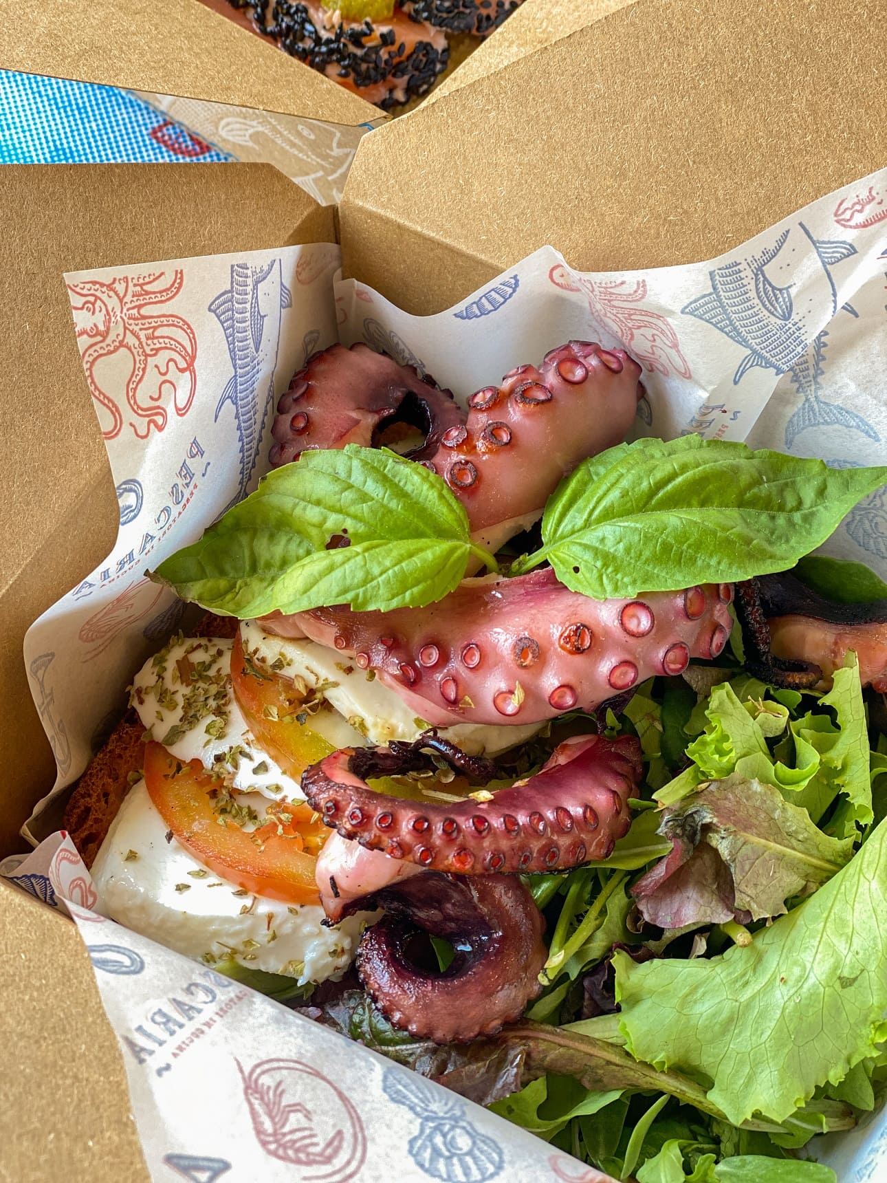 Serviamo anche il polpo arrosto abbinato a caprese di pomodoro, fiordilatte, origano, basilico fresco e olio al limone e spesso usiamo il polpo per le ricette del menù del giorno: lo mettiamo sulle friselle di mare accompagnato con verdure di stagione e salse della casa, lo usiamo come ingrediente nei cornetti di mare insieme a ricotta, zucchine alla poverella, salsa senape e miele o con ceviche di mela, salsa rosa, cipolla caramellata.