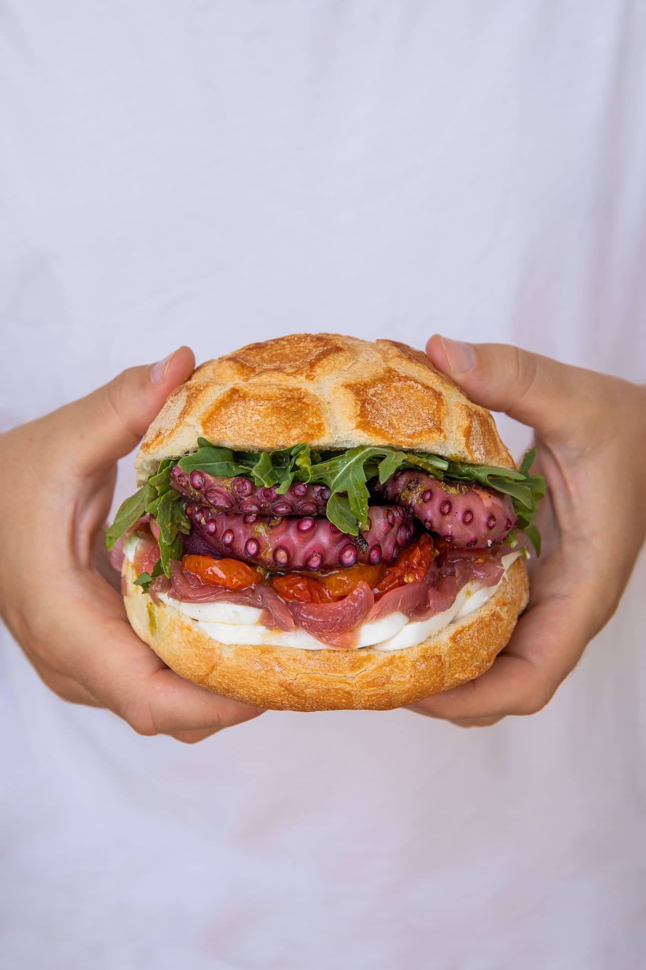 Il polpo è molto versatile in cucina: puoi usarlo per preparare un antipasto di pesce o come ragù per uno spaghetto, o anche come per farci un burger di polpo (a proposito, guarda questa ricetta con il burger di polpo abbinato a salsa alla carbonara, lattuga, salume capocollo, zucchina trifolata con mandorle e fior di latte), o ancora per farci un’insalatina di mare.